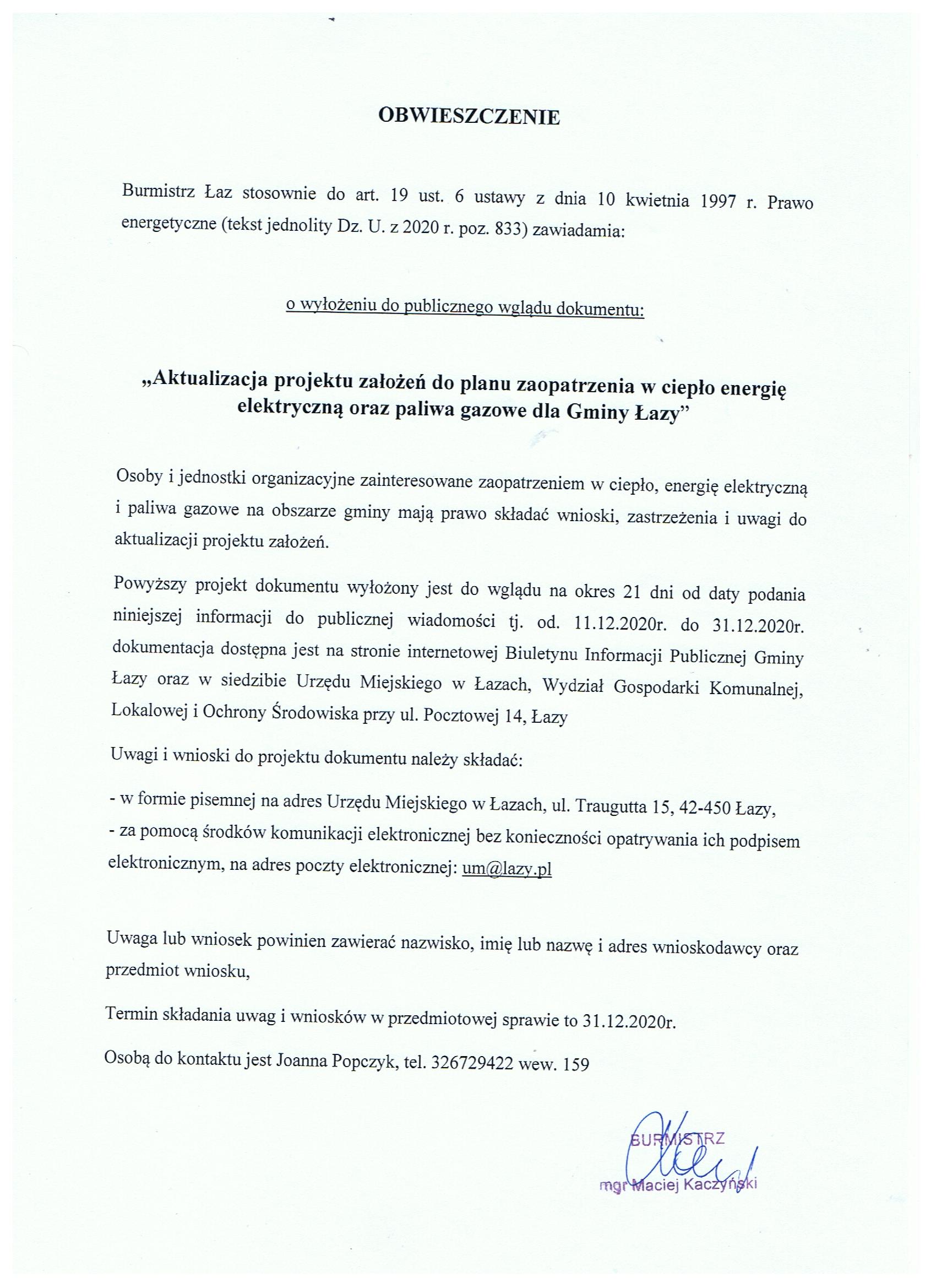 Burmistrz Łaz stosownie do art. 19 ust. 6 ustawy z dnia 10 kwietnia 1997 r. Prawo energetyczne (tekst jednolity Dz. U. z 2020 r. poz. 833) zawiadamia: